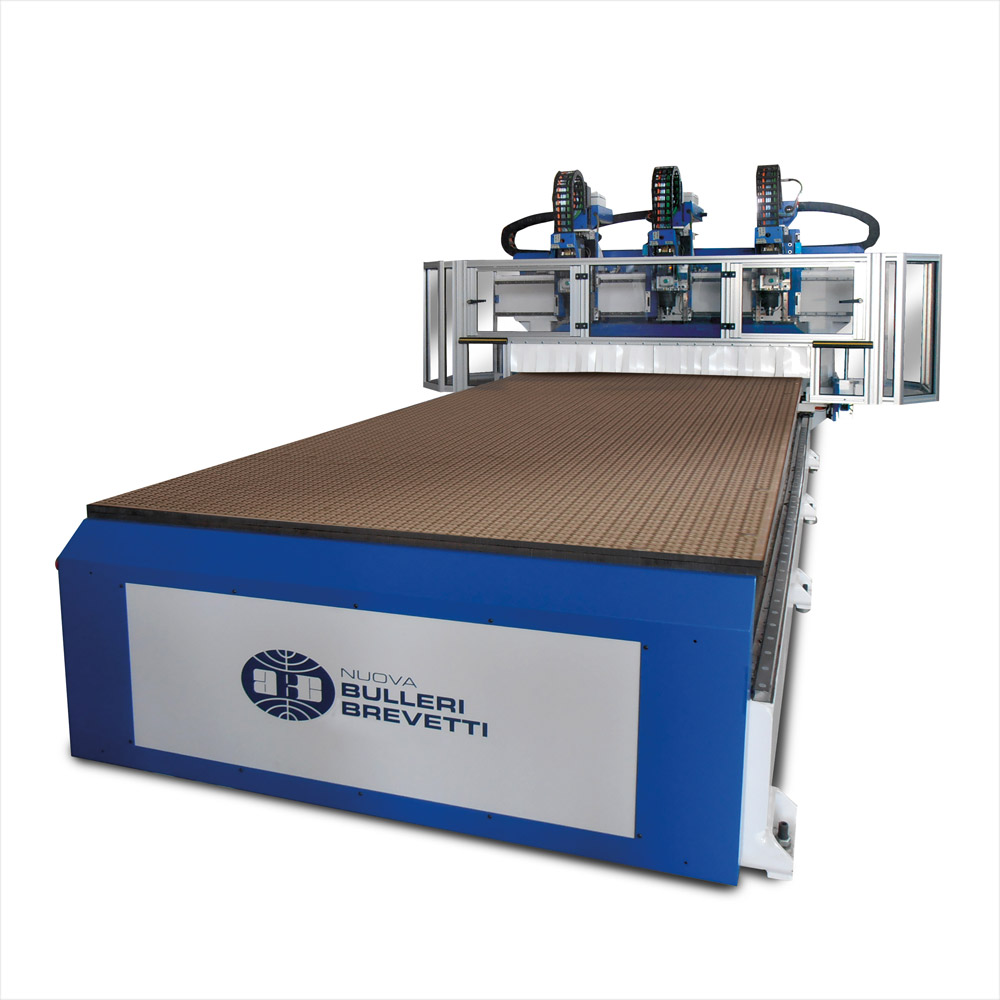 Centro di lavoro per lavorazioni nesting , espressamente studiata per l’ottimizzazione del pannello con tre elettromandrini con interasse variabile, controllato da CNC.