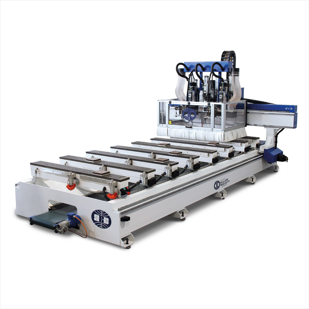 Centro di lavoro BFPM 4016 VS, nasce per l’esigenza del cliente di dover lavorare porta e finestra ancora da assemblare, con relativi archi ed infissi in generale. La macchina è realizzata con ponte chiuso mobile, sistema di movimentazione gantry e barre mobili con ventose. È presente sulla testa operatrice il motore orizzontale a doppie uscite contrapposte, elettromandrino e cambio utensile automatico; mentre, applicate sulle barre vi sono le relative morse per il bloccaggio dei serramenti.