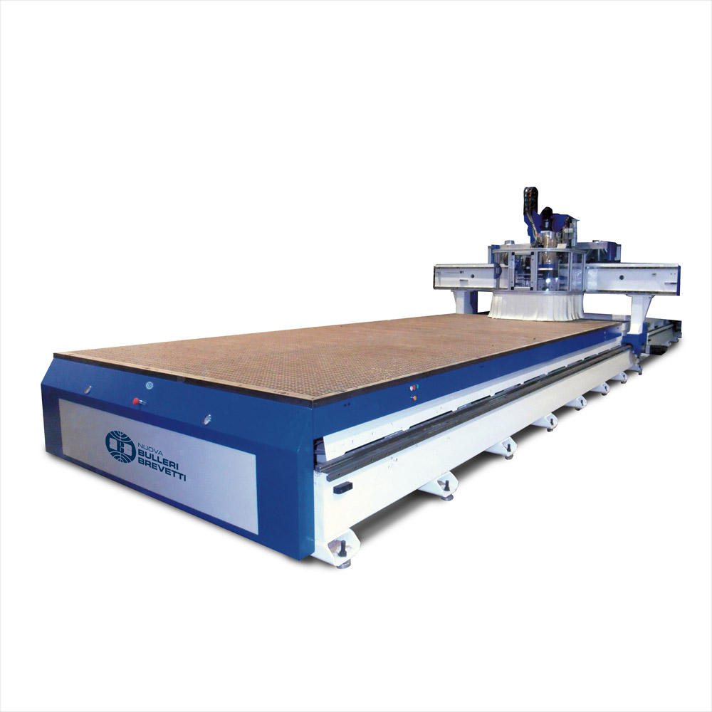 Centro di lavoro in esecuzione speciale con piano da mm 6000 x 2500, progettato per la lavorazione di materiali compositi. La macchina dispone di elettromandrino con cambio utensile automatico trasportato e di gruppo coltellino oscillante per il taglio anche sagomato di pannelli di polistirolo. Dispone di sistema di pulizia automatico del piano, posizionato nella parte posteriore del ponte mobile.