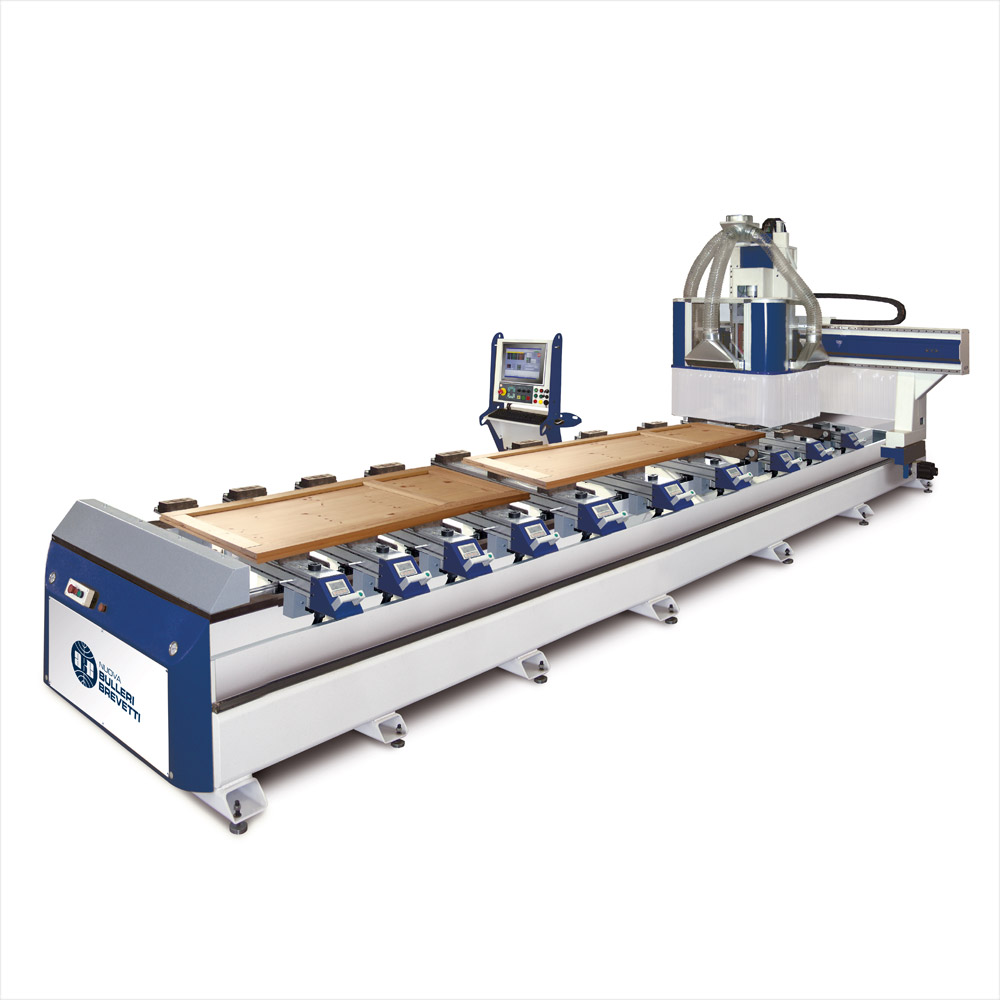 Piano di lavoro attrezzato per la lavorazione di porte con ventose lunghe regolabili in larghezza e nastro trasportatore manuale o motorizzato.